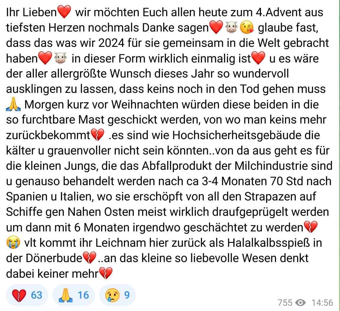 Der untenstehende Post in der Telegramgruppe Kälbchenrettung von Klaus und Nici Reichertz – LINK – hat mich dazu bewogen hier meinen Beitrag zu leisten.